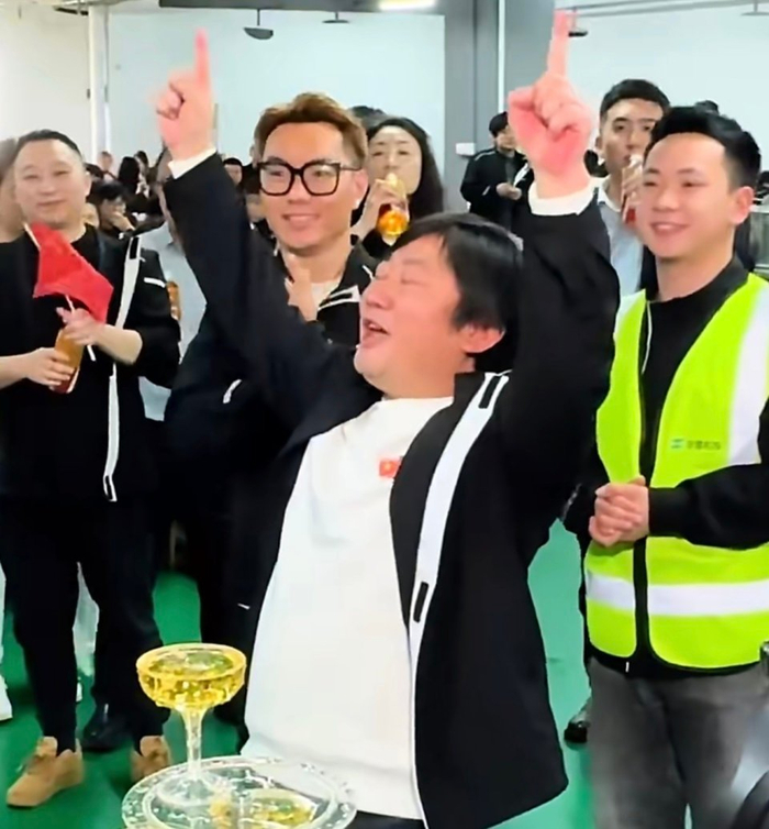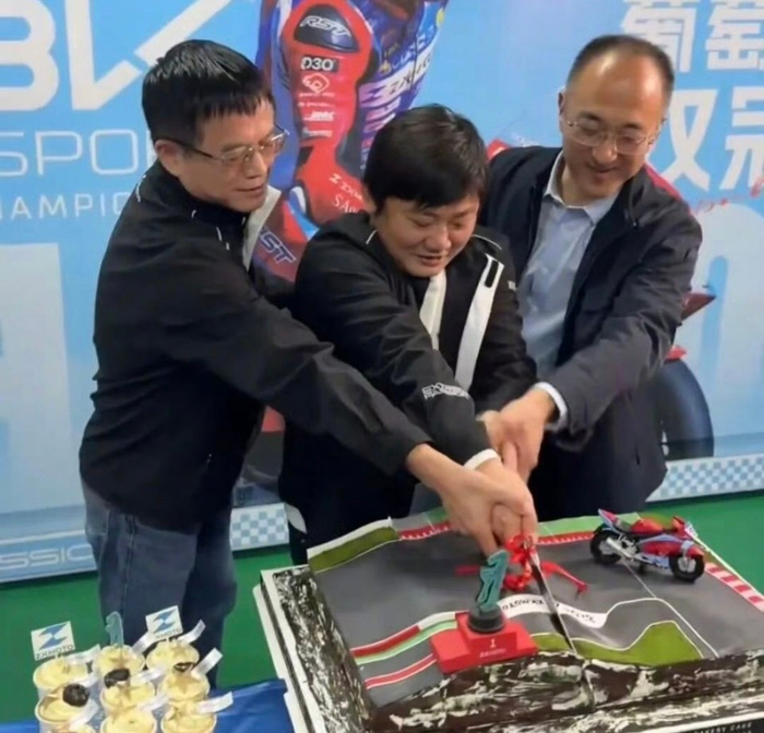 昨天,世界冠军奖杯终于抵达中国,张雪在公司举办庆功宴,第一次捧起这座奖杯!而领先第二名以近4秒优势冲过终点的夺冠瞬间也被做成蛋糕,张雪与浙创投总经理程俊华共同切开蛋糕,并且开香槟庆祝。